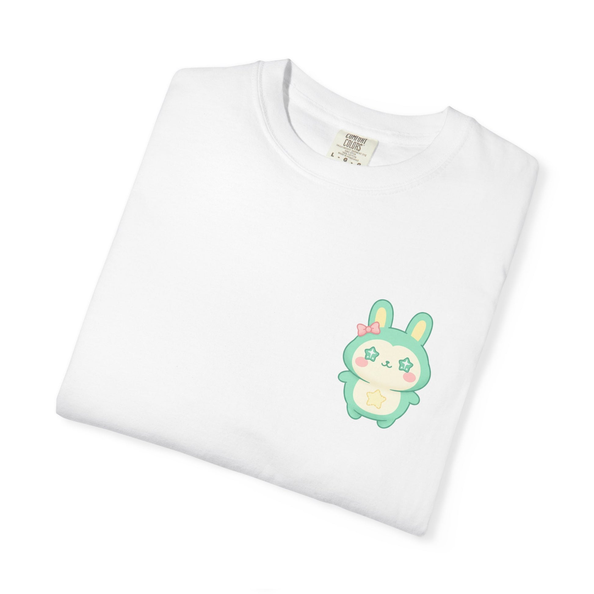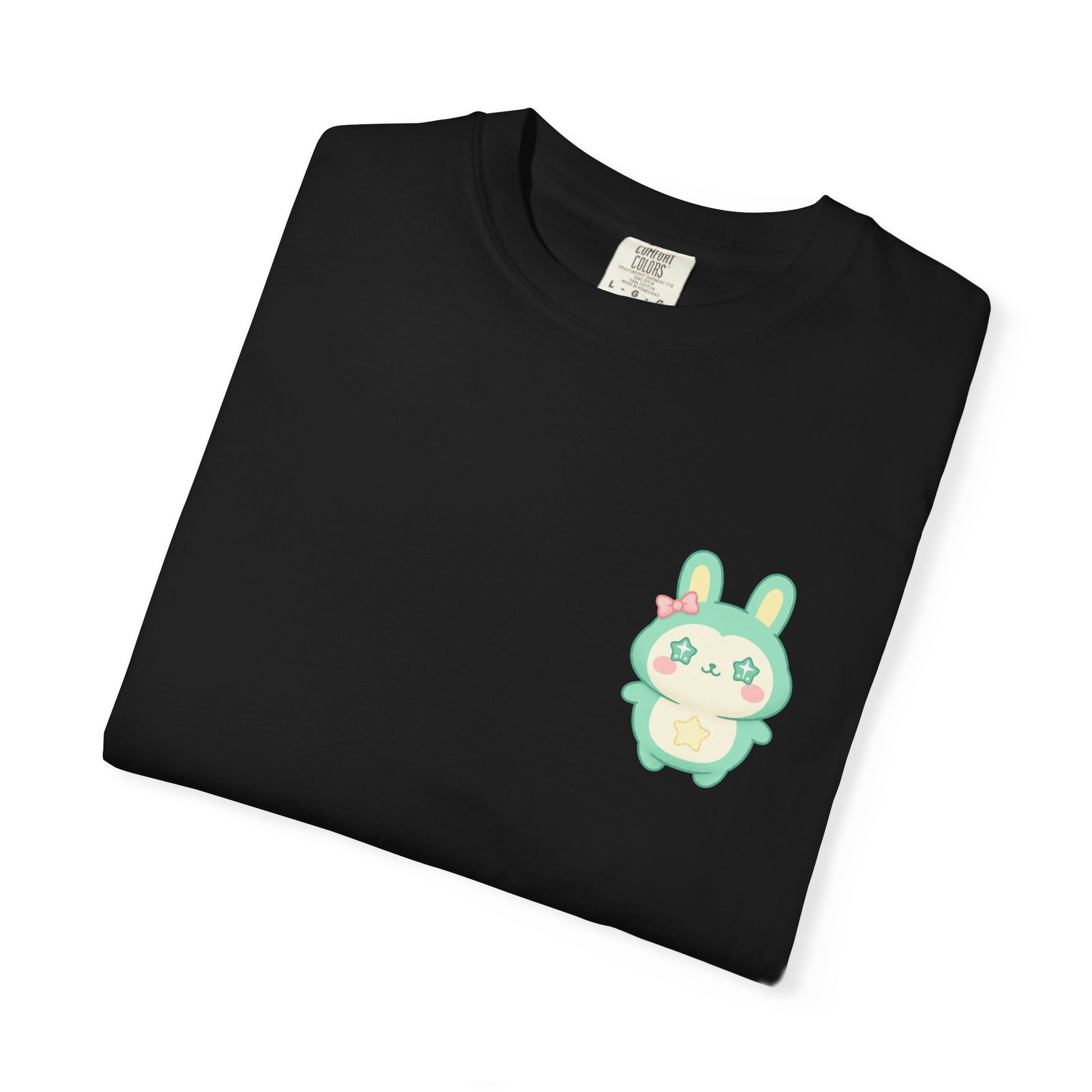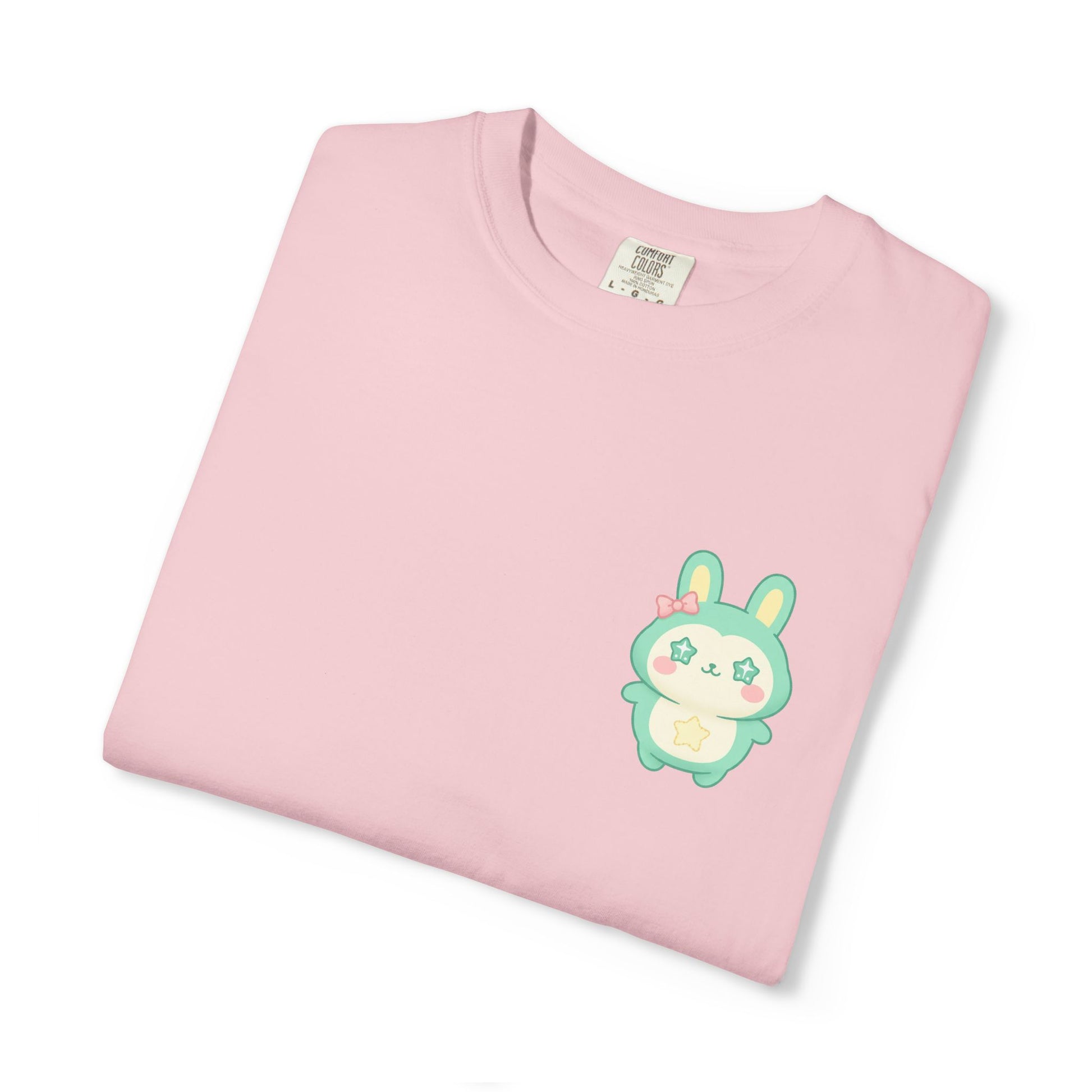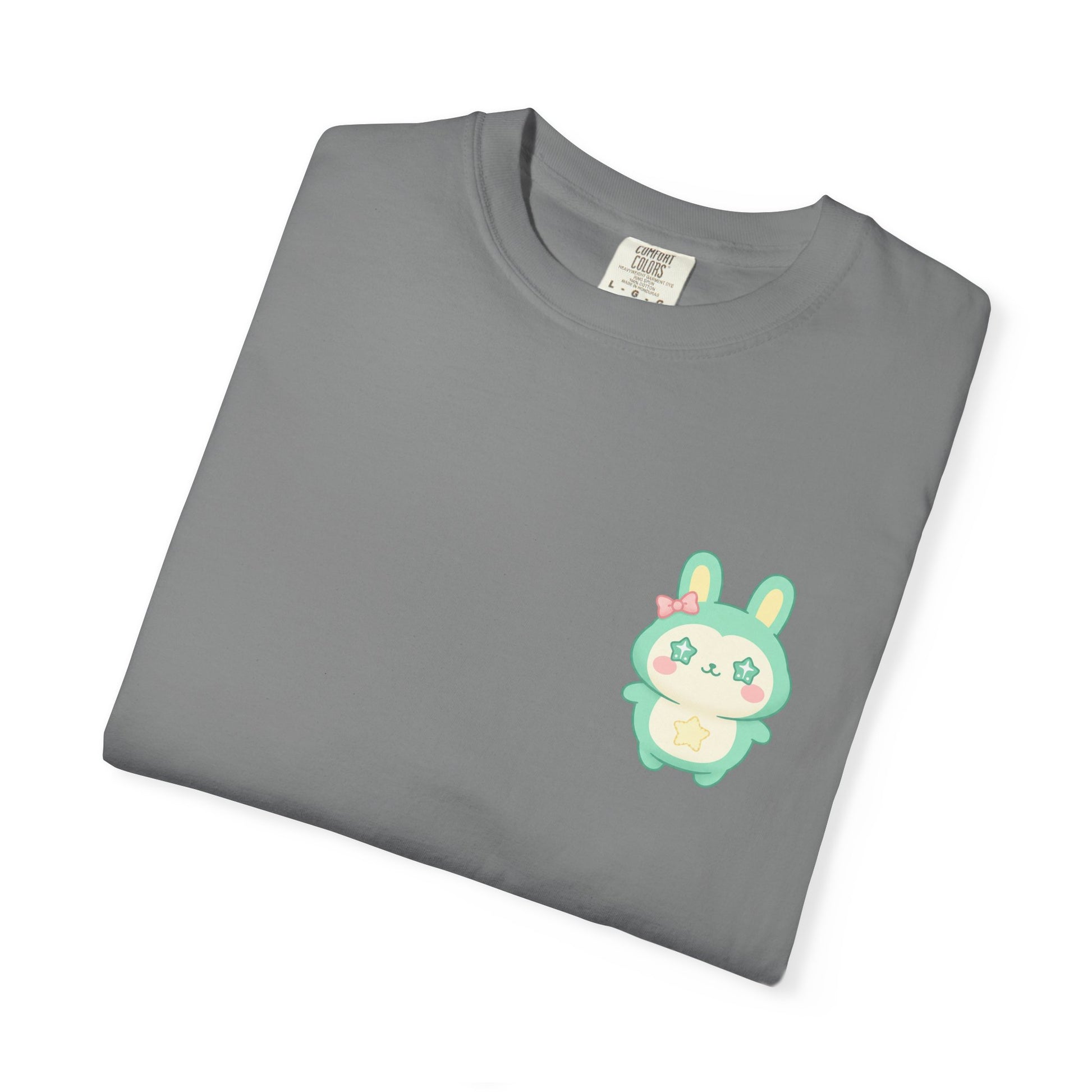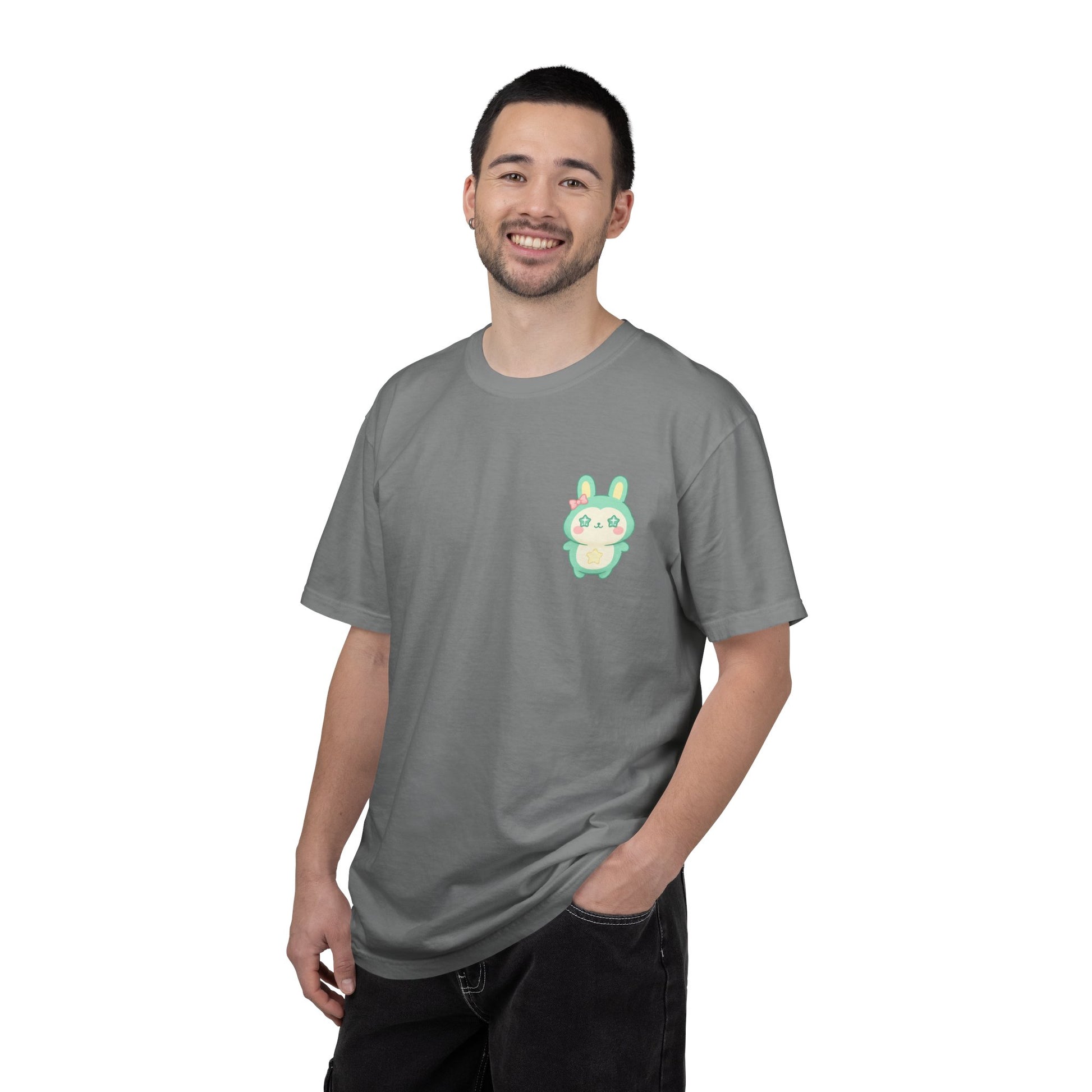 Soft, worn-in cotton meets a tiny pocket buddy. This relaxed garment-dyed tee feels lived-in from day one — a heavyweight knit with a gentle, slightly faded finish. The small pastel bunny sits over the heart, a quiet, playful detail that brightens daily routines without shouting. Slip it on for slow mornings, market runs, or cozy evenings; it layers easily under a flannel or stands alone with jeans. The breathable ring-spun cotton and roomy cut keep movement effortless, while the sewn-in label and durable double-needle stitching mean this tee ages beautifully with you.